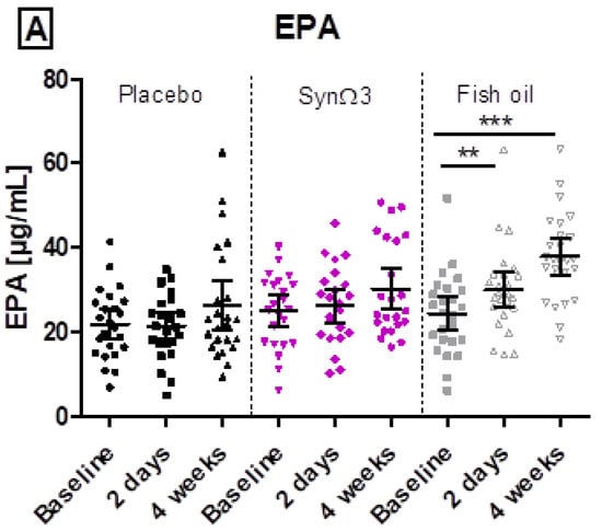 Plasma levels of (A) total EPA and (B) total DHA (μg/mL) at baseline, after 2 days and 4 weeks of intervention; scatter diagram with mean ± 95% CI; ** p < 0.01, *** p < 0.001; significance derived from the investigation of within-group changes and pairwise tests against baseline.