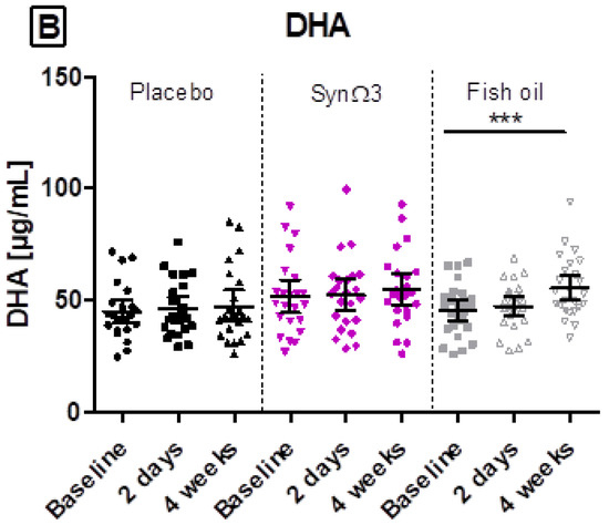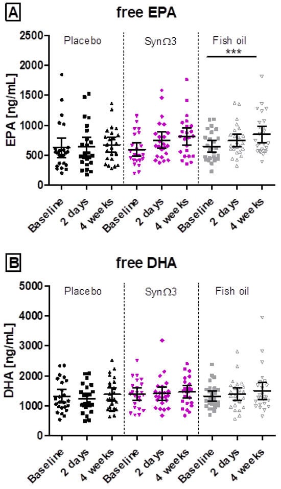 Plasma levels of (A) free EPA and (B) free DHA (ng/mL) at baseline, after 2 days and 4 weeks of intervention; scatter diagram with mean ± 95% CI; *** p < 0.001; significance derived from the investigation of within-group changes and pairwise tests against baseline.