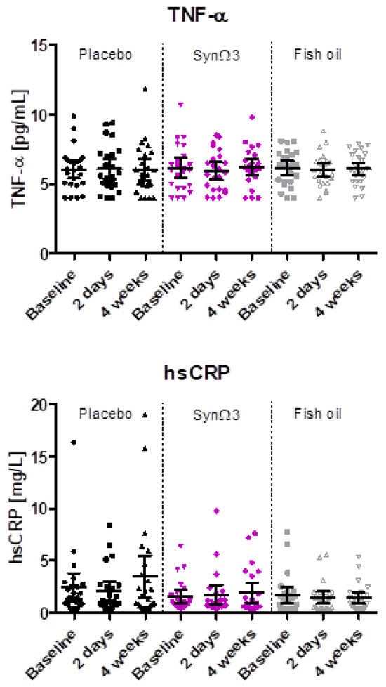 As at-risk individuals were enrolled in the study, defined as at least slightly elevated AGEs and/or a hsCRP level ≥ 1 mg/L, we tested whether the study products display possible effects on the pro-inflammatory markers hsCRP and TNF-α. Overall, no significant changes over time in hsCRP and TNF-α plasma concentrations were observed in any of the study groups (Figure 7). The observed difference by trend (p-value: 0.0862) between mean changes in hsCRP in SynΩ3 and fish oil after 4 weeks of intervention is mainly due to the slight increase in the SynΩ3 group; in contrast, in the fish oil group, average concentrations slightly decreased (Supplementary Table S2).