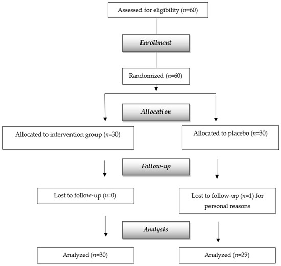 | Variable | Placebo Group (n = 29) | Intervention Group (n = 30) | Total (n = 59) | p-Value between Groups |