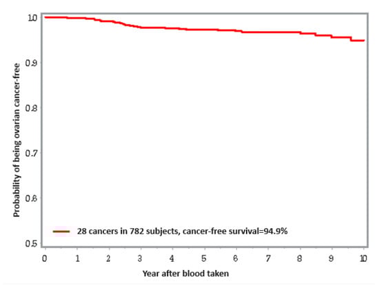 Kaplan–Meir curve for ovarian cancer risk for ten years after blood draw.