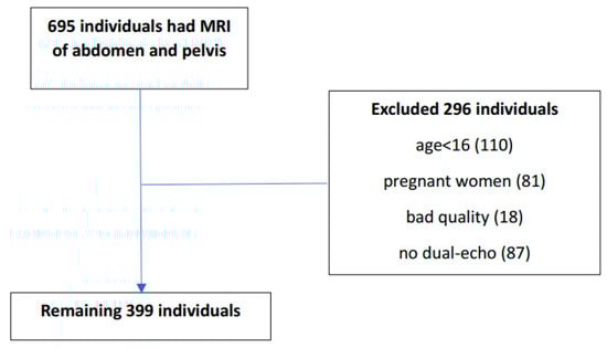 We reviewed 695 MRI abdominal scans that were performed for any indication at the Sheba Medical Center between December 2017 and May 2020. In most cases, the indications for MRI scan were an evaluation of suspected malignancy or follow-up after the removal of an abdominal or gynecological tumor. We excluded MRI scans that were performed on pregnant women (81) or children younger than 16 (110), were of bad quality (18), and/or had no dual-echo phase scans (87). We therefore included in this study 399 MRI scans. (Figure 1). For each subject, we retrieved from computerized charts data on sex, age, weight, height, body mass index (BMI), systolic and diastolic blood pressure (BP), comorbidities (diabetes mellitus, hypertension, dyslipidemia), and renal function tests. Dyslipidemia was defined when an individual either used lipid-lowering agents or had the diagnostic ICD-9 code of dyslipidemia in his chart. We were blind with respect to each patient’s metabolic status and whether they had a known affliction with NAFLD for each scan.