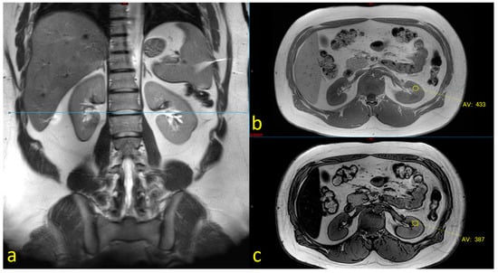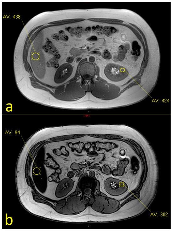 We assessed the fat fractions of the liver and kidneys using MRI dual-echo phase sequencing, a method that is based on the relative chemical shift between water and the methylene peak of fat. Volumetric liver fat can be detected by determining the relative signal loss between in-phase (IP) and opposed-phase (OP) images. This method is one of the imaging methods accepted for identifying and characterizing liver fat fractions [12]. We employed the fat signal fraction formula, i.e., , to evaluate fat accumulation in the kidneys [13]. We measured each kidney at three points (defined on the coronal images): the upper, middle, and lower poles. We then chose the maximal value to calculate the kidney fat fraction. As described by Krievina G. et al. [14], we found higher rates of fat accumulation in the left kidney, and therefore we focused on the left kidney for each case. An illustration of the evaluation of fat in the liver and the kidneys is presented in Figure 2.