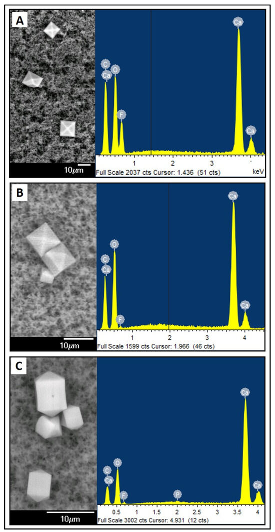 Examples of crystalline precipitates with a calcium-based composition. Electron microscopy photograph and EDS compositional analysis. (A) sample PN1A7; (B) sample PN2A7; (C) sample PN4A7.
