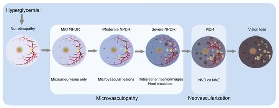 As the most severe of the many worse new pathological microvascular changes caused by diabetes, diabetic retinopathy (DR) is the leading pathogeny of preventable vision loss in the young, especially working-age people worldwide [19]. The International Diabetes Federation (IDF) estimates that, by 2045, the global population aged 20–79 with diabetes will rise to 780 million [20]. It is estimated that 160 million adults will become DR sufferers [21]. Clinically, the confirmation of DR is primarily on the basis of the abnormal appearance of retinal vessels [22,23] (see Figure 1). There are two central disease stages. The first is non-proliferative diabetic retinopathy (NPDR), which is characterized by progressive retinal microvascular lesions. Then, it progresses to the proliferative diabetic retinopathy (PDR) stage, which is characterized by neovascularization [24,25]. NPDR involves retinal changes such as hemorrhages, microaneurysms and hard exudates, with the patients usually being asymptomatic. As NPDR progresses and retinal ischemia occurs, leading to neovascularization of the retina, it advances to PDR, and patients may experience severe visual impairment [24,25]. Additionally, diabetic macular oedema (DMO) refers to the thickening of the posterior pole of the retina and can occur at any stage [25]. Due to the late onset of clinical symptoms, early histological changes are challenging to detect during clinical examinations, and, once detected, irreversible vision loss often occurs. Beyond vision impairment, the degree of retinal damage in diabetic sufferers is significantly related to future risks of cerebrovascular accidents, myocardial infarction and mortality [26]. Therefore, for patients with DR, earlier intervention and timely diagnosis and treatments are necessary for patients with DR to reduce the potential risk of vision loss [27]. Controlling hyperglycemia is the most crucial preventive measure [28].