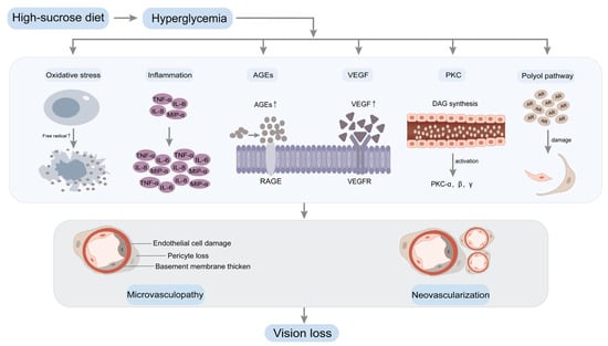 Sugar (sucrose) includes fructose and glucose [67]. An HSD can result in elevated levels of glucose in the bloodstream. Elevated blood glucose levels are pivotal in the pathogenesis of vascular complications associated with diabetes. DR represents the predominant complication of the microvasculature. Extensive research has demonstrated that hyperglycemia, especially long-term sustained high blood glucose levels, serves as a central factor in the occurrence and progression of DR, inducing a variety of biochemical abnormalities [68,69] (Figure 2).