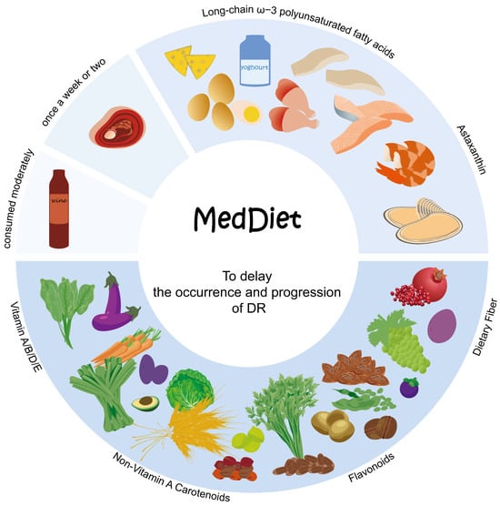 The distinguishing attributes of MedDiet. First, an adequate intake of a huge variety of plant-based foods that are minimally processed, seasonally fresh and locally grown. This includes fruits, vegetables, minimally refined grains, beans and nuts, as they provide a rich array of nutrients such as vitamins, non-vitamin-A carotenoids, flavonoids and dietary fiber. Fresh fruits are incorporated as a regular dessert option. Second, there is a moderate intake of local products derived from milk, primarily yogurt, alongside fish and seafood, to obtain nutrients like LCω3PUFAs and astaxanthin. Third, the consumption of red meat, including processed variants, is limited to once a week or every two weeks, while allowing for moderate wine consumption with meals. MedDiet offers a variety of nutrients that can help to lower blood glucose levels, reduce oxidative stress and mitigate inflammation, thereby exerting a significant impact on retarding the occurrence and progression of DR.