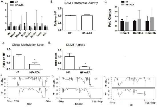 3.5. The AZA Treatment Inhibited DNA Methyltransferase Activation and Thus Decreased the Global DNA Methylation in the Offspring’s Liver
