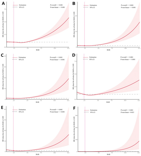 In this study, we considered six transition phases based on the natural progression of T2DM (Figure 1): (A) pre-T2DM to T2DM (n = 5621); (B) T2DM to any of the macrovascular complications (n = 1295); (C) T2DM to any of the microvascular complications (n = 574); (D) T2DM to all-cause death (n = 1264); (E) diabetic macrovascular complication to all-cause mortality (n = 350); and (F) diabetic microvascular complication to all-cause mortality (n = 95). In certain instances, for participants who experienced multiple states on the same date, we calculated the entry date for the first state by subtracting 0.5 [36]. Three models were developed to examine the associations between BAR and the six T2DM trajectory transitions. The unadjusted model was calculated first, followed by adjustments for age and sex (Model 1). Model 2 included additional adjustments for drinking, obesity, smoking, diet, physical activity, eGFR, family history of diabetes, and histories of high cholesterol, hypertension, and cancer. Next, Model 2 was used as the primary model for subsequent analyses to minimize potential bias. We also applied restricted cubic splines (RCS) to assess nonlinearity in the BAR–T2DM trajectory association, using likelihood ratio tests to examine nonlinear relationships.