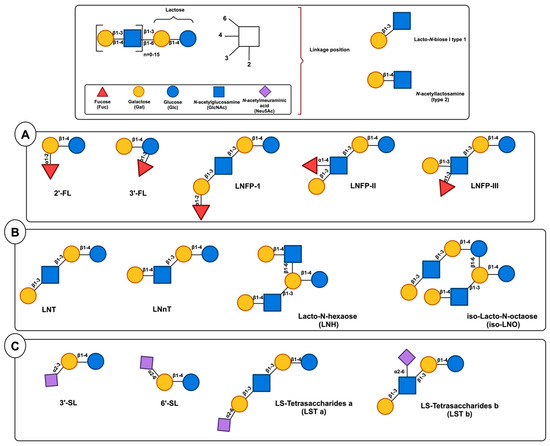 Classification of most common HMOs: (A) Representative fucosylated neutral HMOs; (B) representative non-fucosylated neutral HMOs; (C) representative sialylated HMOs [18,24].