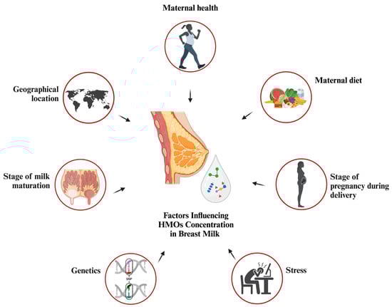 Colostrum is known to have high concentrations of HMOs, but variables other than the duration of lactation that contribute to the variation among women have not been investigated. There are data indicating that there is variation in the prevalence of HMOs among different populations [29]. This variation may be largely attributed to the uneven distribution of milk groups in different geographical regions [30]. Potential non-genetic factors that could influence the difference in HMO contents include the age of the mother, her dietary habits, thereby affecting their body-mass index (BMI), and any severe health conditions she may have (Figure 2) [31].