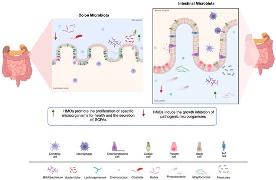 Within the gut, HMOs have the ability to modify the microbiota, causing the growth of Bifidobacterium, Firmicutes, and Actinobacteria. In the colon, HMOs have the ability to induce the proliferation of Bifidobacterium, Bacteroides, and Lachnospiraceae. At the same time, HMOs reduce the number of bacteria that are detrimental to human health. These bacteria include Enterococcus, Proteobacteria, Streptococcus, and Lactobacillus in the gut, as well as Rothia, Enterococcus, and Clostridium in the colon area (Figure 5) [153].