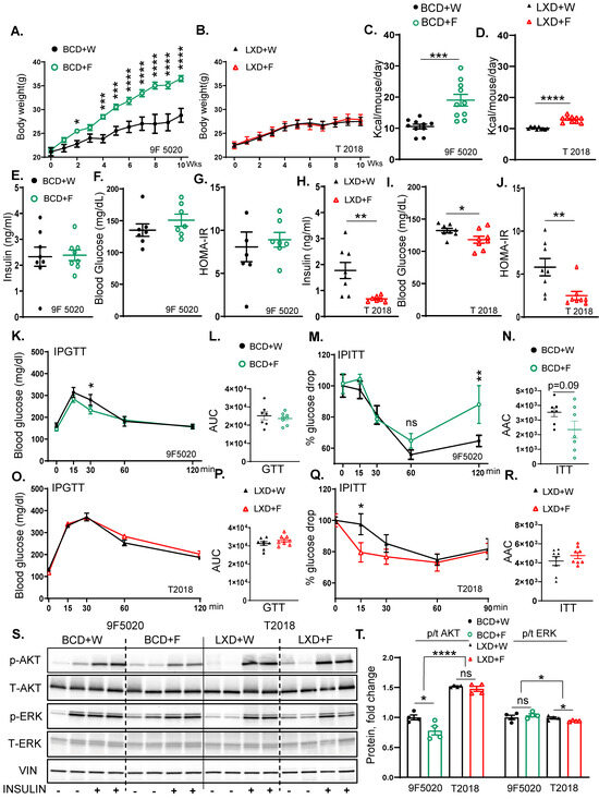 In line with these findings, the glucose tolerance test (GTT) area under the curve (AUC) indicated no significant differences between the BCD + F- and the BCD + W-fed mice (23,655 ± 1133 mg/dL vs. 25,134 ± 2171 mg/dL) (Figure 1K,L). However, a trend for impaired insulin tolerance tests (ITT) (p = 0.09) was observed in the area above the curve (AAC) for the BCD + F-fed group compared to the BCD + W-fed control (2348 ± 586.5 mg/dL vs. 3534 ± 300.0 mg/dL) (Figure 1M,N). Moreover, the blood glucose level at 120 min of ITT was significantly elevated in BCD + F-fed mice compared to BCD + W-fed mice (Figure 1M). On the other hand, on LXD, the AUC for the GTT showed no significant differences between the LXD + F and LXD + W groups (33,003 ± 968.5 ng/mL vs. 31,288 ± 1054 ng/mL) (Figure 1O,P). Similarly, the AAC from the ITT did not demonstrate significant alterations between the LXD + F and LXD + W groups (4766 ± 317.0 ng/mL vs. 4187 ± 466.6 ng/mL), although blood glucose was better in the LXD + F group at 15 min compared to the LXD + W group (Figure 1Q,R).