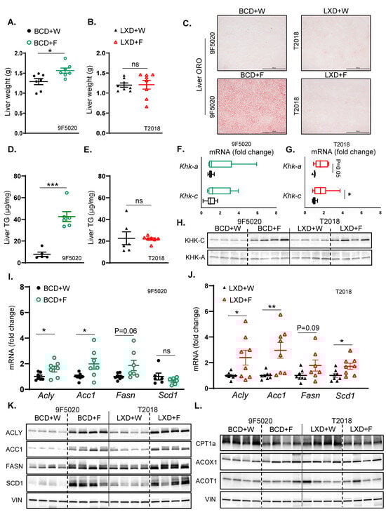Fructose supplementation on BCD but not on LXD supports hepatic steatosis. (A) Liver weights of BCD-fed mice at sacrifice after 10 weeks on the diet. (B) Liver weights of LXD-fed mice at sacrifice after 10 weeks on the diet. (C) Oil Red O staining of liver sections from BCD and LXD-fed mice, showing hepatic lipid accumulation. (D) Hepatic triglyceride (TG) content in BCD-fed and (E) LXD-fed mice given fructose or regular water. (F) mRNA expression of KHK isoforms in the liver of BCD-fed (G) and LXD-fed mice. (H) Protein levels of KHK isoforms in the liver of BCD and LXD-fed mice, respectively. (I) Hepatic mRNA expression of enzymes involved in fatty acid synthesis in BCD-fed (J) and LXD-fed mice; n = 7–8 mice per group. (K) Protein levels of enzymes involved in hepatic fatty acid synthesis in the livers of BCD and LXD-fed mice, respectively. (L) Protein levels of enzymes involved in hepatic fatty acid oxidation in BCD and LXD-fed mice (n = 4 mice/group). Statistical comparisons were conducted using Student’s t-test for pairwise comparisons between the control and fructose groups. Statistical significance is indicated by asterisks (*) when comparing fructose-supplemented groups to their respective controls: * p < 0.05; ** p < 0.01; *** p < 0.001; ns = not significant. Data are presented as mean ± SEM.
