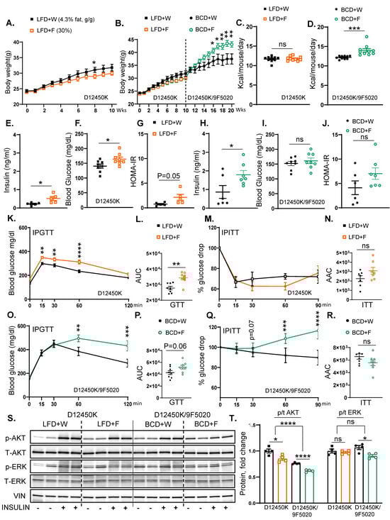 The assessment of hepatic insulin signaling revealed that fructose supplementation in the LFD group significantly reduced Akt phosphorylation compared to the LFD + W control group (Figure 3S,T). Similarly, fructose supplementation of the BCD-fed mice resulted in a significant reduction in the insulin-stimulated Akt phosphorylation compared to the BCD + W-fed control. Overall, Akt phosphorylation was higher in all LFD-fed mice compared to those on BCD. Furthermore, ERK phosphorylation increased in all mice treated with insulin, regardless of the dietary composition (Figure 3S,T). In summary, fructose supplementation led to increased weight gain when mice were transitioned from the LFD to the BCD. Interestingly, in both the LFD and BCD groups, fructose consumption impaired some aspects of glucose tolerance and insulin resistance compared to their respective controls. Moreover, in LFD-fed mice, adverse changes in glycemic status with fructose ingestion were observed despite no significant increase in body weight.
