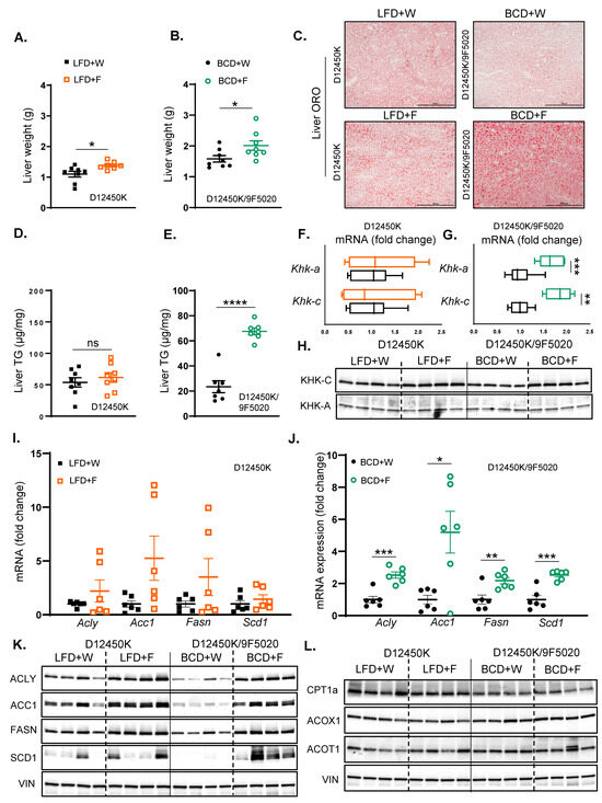 In the LFD-fed mice, fructose supplementation did not elicit significant changes in the hepatic mRNA levels of key enzymes involved in fatty acid synthesis, including Acly, Acc1, Fasn, and Scd1, when compared to the LFD + W-fed controls (Figure 4I). In contrast, fructose supplementation in the BCD-fed mice led to a significant upregulation of hepatic mRNA levels of Acly, Acc1, Fasn, and Scd1 relative to the BCD + W-fed mice (Figure 4J). At the protein level, the LFD + F group exhibited increased levels of ACLY, ACC1, and FASN compared to the LFD + W group (Figure 4K; Supplemental Figure S5B). Similarly, in the BCD group, fructose supplementation resulted in a significant elevation of protein levels for ACLY, ACC1, FASN, and SCD1 compared to the BCD + W-fed control (Figure 4K; Supplemental Figure S5B). Moreover, the BCD had lower baseline levels of DNL enzymes; hence, fructose supplementation resulted in a greater fold increase in DNL enzymes in mice on BCD than on LFD (Supplemental Figure S5C). This is consistent with the greater induction of KHK-C protein in the mice on the BCD than on the LFD.