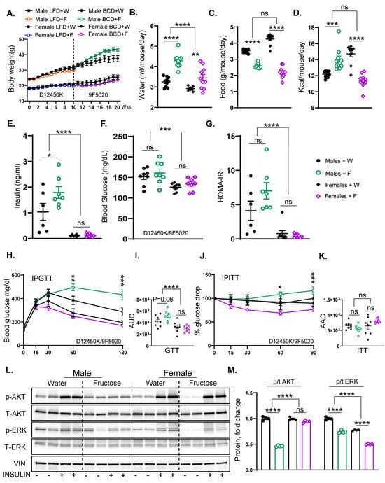 Fructose supplementation results in weight gain and insulin resistance in male but not female mice. (A) Weight gain in male and female mice on LFD for 10 weeks who were then switched over to BCD for another 10 weeks and supplemented with either regular water or 30% fructose-sweetened water (n = 16 mice/group for first 10 weeks and n = 8 mice/group for the next 10 weeks). (B) Water consumption, (C) food consumption, and (D) total calorie intake of male and female mice from weeks 11 to 20 on the diets. (E) Fasting insulin levels, (F) blood glucose concentrations, and (G) HOMA-IR in male and female mice after 20 weeks on the diet. (H) Glucose tolerance test (GTT) results (I) and area under the curve (AUC) analysis for male and female mice, performed after 18 weeks on the diet. (J) Insulin tolerance test (ITT) and (K) area above the curve (AAC) analysis for male and female mice, performed after 18 weeks on the diet. (L) Western blot analysis (WB) of phosphorylated and total AKT and ERK proteins in liver tissues of male and female mice, respectively, and (M) Image J quantification showing protein levels of phosphorylated and total AKT and ERK (n = 4 mice/group). Statistical analysis was performed using two-way ANOVA followed by Tukey’s post hoc test for comparisons across multiple groups. Statistical significance, denoted by asterisks (*), represents comparisons of fructose-supplemented groups to their respective controls, as follows: * p < 0.05; ** p < 0.01; *** p < 0.001; **** p < 0.0001; ns = not significant. All data are expressed as mean ± SEM.