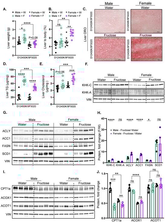 Similar to male mice, female mice supplemented with fructose exhibited a significant reduction in the CPT1A protein levels compared to those receiving regular water (Figure 6I,J). Conversely, Acox1 and Acot1 protein levels showed no significant alterations in either male or female mice following fructose supplementation (Figure 6I,J). In summary, fructose supplementation in both male and female mice resulted in a significant increase in KHK-C protein levels, along with elevated levels of ACLY, ACC1, FASN, and SCD1 proteins. The increase in KHK-C and DNL enzymes was stronger in female mice, in agreement with a higher liver-to-body weight ratio and liver steatosis.