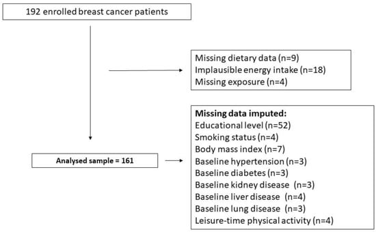 The current research was an analysis of an independent observational study conducted under the ATHENA project, a double-blind, randomized, placebo-controlled trial to test the effects of purple corn cob-derived-anthocyanin supplementation on skin toxicity among BC patients undergoing radiotherapy [18]. Overall, 161 women with BC who underwent radiotherapy were finally analyzed in the current study. Detailed accounts of the ATHENA project’s randomized clinical trial (RCT) methodology are published elsewhere [18]. A flow chart of the ATHENA trial is shown in Figure 1.