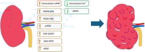 The primary causes of ADPKD are heterozygous mutations in the PKD genes; PKD-1 (85% of cases) and PKD-2 (15% of cases). These genes encode polycystin 1 and polycystin 2, respectively, which together form a transmembrane protein complex that plays crucial roles in regulating multiple signalling pathways involved with cellular metabolism, proliferation, differentiation, and apoptosis [10,11,12,13,14]. Decreased calcium influx, elevated cyclic adenosine monophosphate (cAMP) levels, and the abnormal activation of the mitogen-activated protein kinases (MAPK)-extracellular signal-regulated kinases (ERK) signalling pathway in renal epithelial cells are key drivers of cystogenesis [15]. Other proposed mechanisms implicated in cyst growth and expansion include dysregulated signalling pathways involving G-coupled proteins, the mammalian target of rapamycin (mTOR), phosphoinositide 3-kinase (PI3K)–protein kinase B (PKB), AMP-activated protein kinase (AMPK), Janus kinase 2 (JAK2)–signal transducer and activator of transcription (STAT), and nuclear factor of activated T cells (NFAT) [12,13,16,17,18]. Additionally, the aberrant activation of epidermal growth factor (EGF) and its receptor (EGFR) signalling has been linked to cyst expansion [19]. Figure 1 presents a simplified schematic diagram illustrating the fundamental pathological mechanisms of ADPKD.