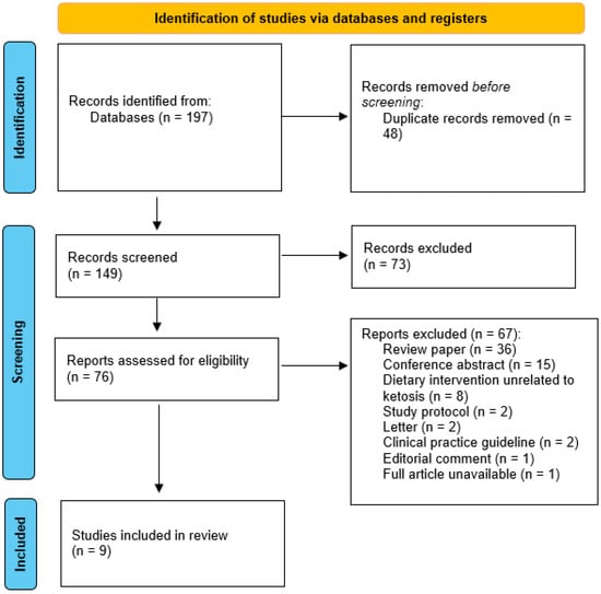 Database searches identified 197 records. After removing 48 duplicates, the titles and abstracts of the remaining 149 records were screened, resulting in the exclusion of 73 records. A full-text review of the remaining 76 records was conducted to assess eligibility, leading to the exclusion of 67 records. The primary reasons for exclusion were review papers (n = 36), conference abstracts (n = 15), and dietary interventions unrelated to ketosis (n = 8). The selection process is detailed in the PRISMA flow diagram (Figure 2).