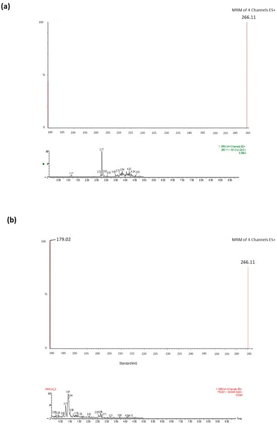 A sample (3 g) of the product mixture coming from a standard synthetic procedure was purified by flash column chromatography on silica gel 60 (230–400 mesh) with cyclohexane-ethyl acetate-methanol (3:5:0.5) as the eluent. The eluted fractions were analyzed TLC on silica gel 60 F254 with cyclohexane-ethyl acetate-methanol (1:7:1) as the eluent and phosphomolybdic acid as the detection agent. The fractions containing pure DAG-ΒHB (rf = 0.3) and MAG-ΒHB (rf = 0.2) were collected, and the eluent was removed under vacuum. The molecular weights of the pure compounds were determined by mass spectrometry (Figure 1a,b). The structures of the pure compounds were assigned by 1H- and 13C-NMR analysis (Supplementary Figure S1a–d). For a more accurate interpretation of the 1H-NMR spectra, the corresponding two-dimensional COSY experiments were performed (Supplementary Figure S2a,b).