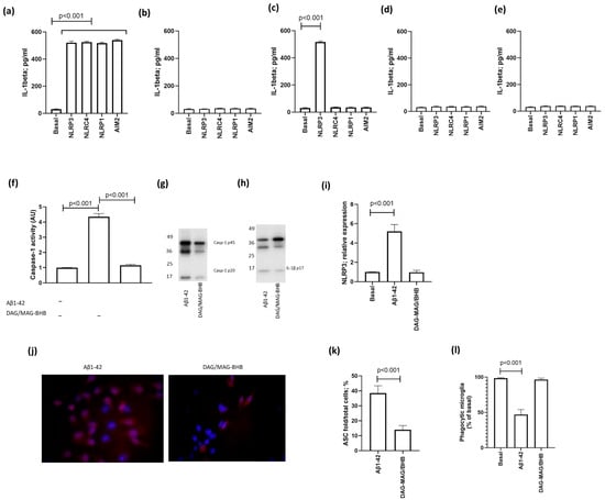 Low glucose levels have been implicated in increasing neuronal vulnerability to oxidative stress and inflammation, further aggravating the neurodegenerative processes in the brain. When glucose levels plummet, such as during fasting or metabolic dysfunction, microglia may undergo metabolic reprogramming, leading to heightened inflammasome activation enabling Aβ deposition. We assessed whether Aβ and low-glucose conditions were able to modify inflammasome activation in microglial cells. We first assessed the activation of NACHT, LRR, and PYD domains-containing protein 3 (NLRP3), NLR family CARD domain-containing protein 4 (NLRC4), NLR family pyrin domain-containing protein 1 (NLRP1), and absent in melanoma 2 (AIM2), which belong to a family of intracellular pattern recognition receptors known as NOD-like receptors (NLRs), which play crucial roles in the innate immune system by sensing various pathogen- or danger-associated molecular patterns. Activation of these inflammasomes triggers caspase-1-mediated proteolytic processing and secretion of pro-inflammatory cytokines, contributing to host defense against pathogens and inflammatory responses to cellular damage. NLRP3, NLRC4, NLRP1, and AIM2 inducers were used to treat microglial cells, and IL-1beta was used as a marker of activation. Microglia cells showed an increased secretion of IL-1beta after the activation of all of the tested inflammasomes (p < 0.001; Student’s t test) (Figure 4a). Amyloid-beta (Aβ1-42)-primed microglial cells showed no inflammasome activation in normal glucose (25 mM) medium (Figure 4b), while the microglial cells showed the activation of NLRP3 inflammasome in low glucose (5.5 mM) media (p < 0.001; Student’s t test) (Figure 4c). As it has been suggested that Aβ1-42-induced NLRP3 inflammasome activation is sustained by TLR4, we performed a pharmacological inhibition of TLR4 by CLI-095. This treatment abolished Aβ1-42-induced NLRP3 inflammasome activation in low glucose conditions (Figure 4d). When we treated the Aβ1-42-primed microglial cells maintained in low glucose condition with DAG/MAG-BHB, we observed no induction of NLRP3 inflammasome activation, similar to TLR4 inhibition (Figure 4e). Similar to this, immunoblotting demonstrated that Aβ1-42-priming and low glucose increase the level of active caspase-1 (p20) (p < 0.001; Student’s t test) (Figure 4f,g) and IL-1beta (IL-1beta p17) (p < 0.001; Student’s t test) (Figure 4h). In addition, low glucose dramatically raised the levels of NLRP3 mRNA in Aβ1-42-primed microglia (p < 0.001; Student’s t test) (Figure 4i). In response to the accumulation of amyloid-beta plaques, microglia can activate the inflammasome, leading to the formation of ASC specks and subsequent release of pro-inflammatory cytokines, such as IL-1beta. While this inflammatory response initially aims to clear the amyloid-beta deposits, chronic activation of microglia and sustained release of inflammatory mediators can contribute to neurotoxicity and synaptic dysfunction, exacerbating neuronal damage. According to an immunofluorescence examination, Aβ1-42-priming and low glucose induced the creation of ASC specks, as revealed by the increased fluorescence in microglial cells (Figure 4j,k). The formation of ASC specks was significantly reduced by DAG/MAG-ΒHB treatment (p < 0.001; Fisher’s exact test) (Figure 4j,k). NLRP3 inflammasome activation also impacts on microglia’s phagocytic activity, essential for the maintenance of the correct health status in the brain. Aβ1-42-priming and low glucose conditions are able to reduce phagocytic activity, as shown in Figure 4l (p = 0.001; Fisher’s exact test), where HCM3 displayed decreased phagocytic ability in bead uptake experiments. DAG/MAG-ΒHB addition corrected this decline in phagocytic activity returning to the condition of basal phagocytosis (Figure 4l). These findings point to a direct involvement of DAG-MAG/ΒHB treatment in NLRP3 activation in AD brain.