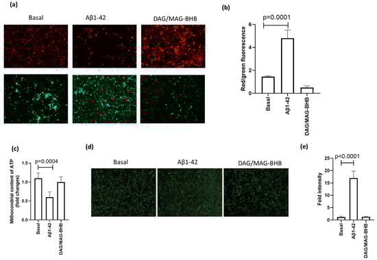 NLRP3 activation might influence mitochondrial activity, as recent studies have unveiled the pivotal roles of mitochondria in the initiation and regulation of NLRP3. We evaluated the mitochondrial activity in HCM3 treated Aβ1-42 and maintained in low glucose medium. We observed that the mitochondrial membrane potential was reduced by Aβ1-42 priming, and DAG/MAG-ΒHB treatment restored the basal condition (p = 0.0001; Student’s t test) (Figure 5a,b). The modification in mitochondrial membrane potential reduced ATP mitochondrial content (p = 0.0004; Student’s t test) (Figure 5c), and DAG/MAG-ΒHB treatment restored the basal condition (Figure 5c). As a proof of concept of mitochondrial stabilization, we evaluated ROS generation, which has been suggested to be an absolute requirement for activation of the NLRP3 inflammasome [35]. We observed that Aβ1-42 priming increased ROS levels in HCM3 cells (p < 0.0001; Student’s t test) (Figure 5d,e), and DAG/MAG-ΒHB treatment was able to restore basal ROS levels even in the presence of an NLRP3 inducer (Figure 5d,e).