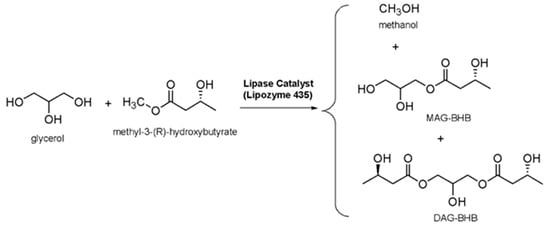DAG/MAG-ΒHB is synthesized by transesterification of glycerol with methyl (R)-3-hydroxybutyrate [21]. The reaction is catalyzed by the lipase B from Candida antarctica—CAL-B (Lipozyme 435; Novozyme, Lyngby, Denmark), and methanol is formed as the coproduct (Scheme 1: overall reaction).