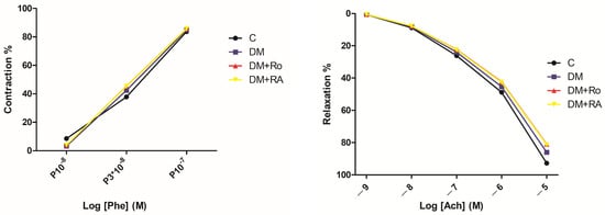 Contractile responses of aortic rings to cumulative concentrations of phenylephrine (Phe, left) and relaxation responses of aortic rings to cumulative concentrations of acetylcholine (Ach, right). The contractile and relaxing responses were tested for the control group and groups with DM treated with the vehicle, R. officinalis extract (Ro), and RA. No statistically significant differences between groups were noticed.