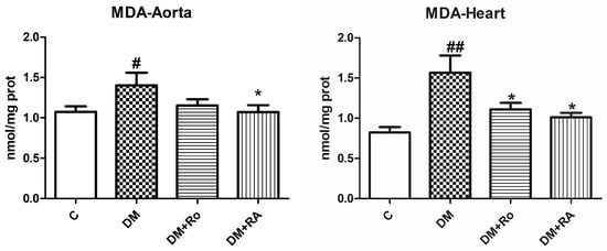 Malondialdehyde (MDA) levels increased in the aorta and heart homogenates of animals with DM compared to the control (p < 0.05). Lipid peroxidation was significantly decreased both in the aorta after RA administration (DM vs. DM + RA, p < 0.05) and heart (DM vs. DM + RA, p < 0.05). The same beneficial effect was found after the R. officinalis extract administration (DM vs. DM + Ro, p < 0.05 (Figure 2).