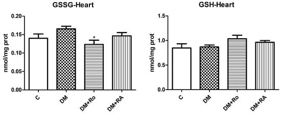 The treatment with R. officinalis significantly reduced the oxidized glutathione (GSSG) levels in the heart of diabetic animals (DM vs. DM + Ro, p < 0.05) compared to the DM group (Figure 4).