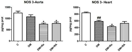 The nitric oxide synthetase 3 (NOS 3) levels diminished in the heart homogenates of animals with DM (p < 0.001 vs. control). NOS3 levels also decreased significantly in the aorta of animals with DM treated with R. officinalis/RA compared to animals with DM (DM vs. DM + Ro, DM vs. DM + RA, p < 0.01) and in the heart of animals with DM treated with the R. officinalis extract compared to animals with DM (DM vs. DM + Ro; p < 0.01) (Figure 5).