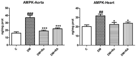 Activated AMP protein kinase (AMPK) secretion increased significantly after streptozotocin administration (DM vs. C, p < 0.05), while the administration of the R. officinalis extract and RA reduced AMPK levels in aorta and heart homogenates (DM vs. DM + Ro, p < 0.001; DM vs. DM + RA, p < 0.05) (Figure 6).
