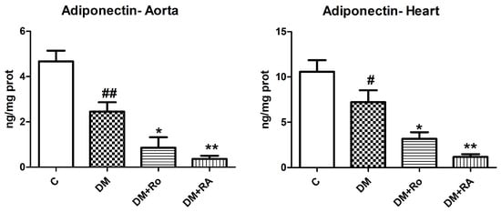 Adiponectin levels in heart and aorta homogenates in DM and rats with DM treated with R. officinalis and RA. Adiponectin levels decreased in the aorta and heart homogenates of DM rats (#, ## p < 0.01) and after the administration of the R. officinalis extract and RA (*, ** p < 0.05). Each group consisted of 9 rats. Results are expressed as mean ± SD.