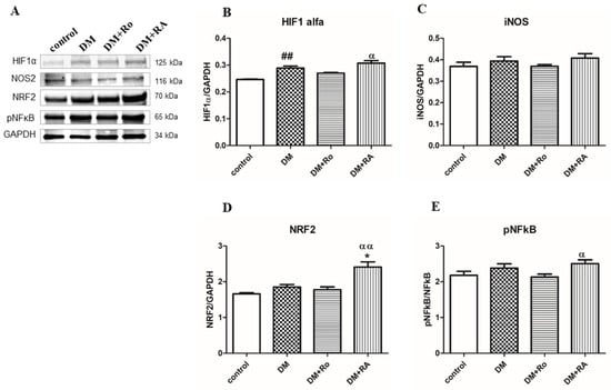 The effects of the R. officinalis extract and RA administration on the expression of HIF 1α, iNOS, NRF2, and pNF-κB in the heart. (A) Expression of HIF 1α, iNOS, NRF2, and pNF-κB was analyzed using Western blotting (WB). (B) HIF 1α, (C) iNOS, (D) NRF2, and (E) pNF-κB. Image analysis of Western blot bands was carried out using densitometry, and the results were normalized to GAPDH. * DM vs. DM + Ro/DM + RA; α DM + Ro vs. DM + RA. Results are expressed as mean (n = 3) ± SD; *, α p < 0.05; ##, αα p < 0.01.