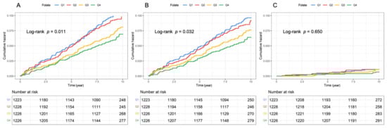 - Liu, Y.; Geng, T.; Wan, Z.; Lu, Q.; Zhang, X.; Qiu, Z.; Li, L.; Zhu, K.; Liu, L.; Pan, A.; et al. Associations of Serum Folate and Vitamin B12 Levels with Cardiovascular Disease Mortality Among Patients with Type 2 Diabetes. JAMA Netw. Open 2022, 5, e2146124. [Google Scholar] [CrossRef]