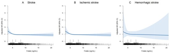 - Van Guelpen, B.; Hultdin, J.; Johansson, I.; Stegmayr, B.; Hallmans, G.; Nilsson, T.K.; Weinehall, L.; Witthoft, C.; Palmqvist, R.; Winkvist, A. Folate, vitamin B12, and risk of ischemic and hemorrhagic stroke: A prospective, nested case-referent study of plasma concentrations and dietary intake. Stroke 2005, 36, 1426–1431. [Google Scholar] [CrossRef]