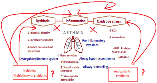 The aim of this study is to present the state of knowledge on the participation of dysbiosis and reactive oxygen species in the development of asthma. Moreover, this paper reviews the latest data on the role of probiotics, prebiotics, and antioxidants in this area.