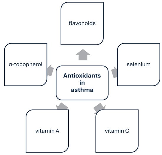 Some studies [91,92,93] suggest that an increased intake of antioxidants may lead to a reduced burden of severe asthma. In Larkin et al.’s [94] prospective study, α-tocopherol within normal reference ranges was associated with decreased asthma development. Tan et al. [95] demonstrated that vit. A-regulated ciliated cells repair the damaged airway epithelium caused by asthma and maintain the integrity of the airway epithelium. However, Checkley et al. [96] reported that early life vit. A administration in regions with chronic vitamin deficiency was not associated with a lower risk of asthma. A study published in the same year [97] on the use of flavonoids in the course of asthma confirmed a reduction in airway inflammation. Suna et al. [98] reported that asthmatic women exhibited lower total antioxidant status compared to the control group, but no significant differences were noted in the dietary intake of antioxidant micronutrients. The group of healthy participants had a significantly higher intake of anthocyanidins compared to asthmatics. The study suggests that a diet rich in flavonoids may help reduce inflammation and oxidative stress. Cho et al. [99] showed that treatment with soy isoflavones reduce the number of severe asthma exacerbations.