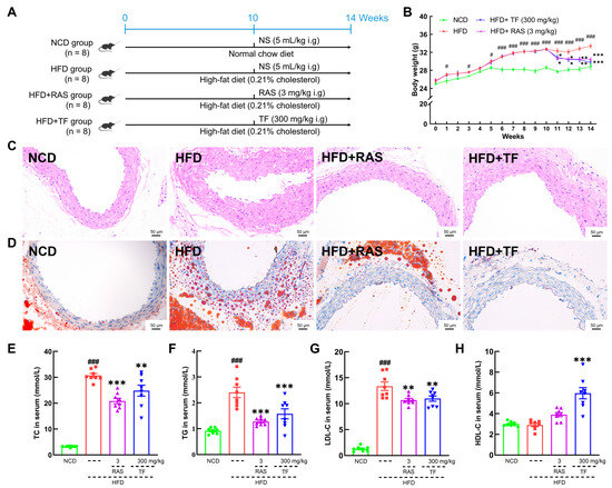 The establishment and treatment processes of the HFD-induced ApoE−/− mice model are presented in Figure 1A. Following acclimatization, ApoE−/− mice were provided with HFD, while C57BL/6J mice were fed normal chow diet (NCD) for 14 weeks. (The details of the ingredients of HFD and NCD are presented in Table S1). From the beginning of the 11th week, the ApoE−/− mice were allocated randomly into three groups: the HFD group (n = 8, normal saline (NS) 5 mL/kg), the HFD+RAS group (n = 8, Rosuvastatin (RAS) 3 mg/kg) and the HFD+TF group (n = 8, TF 300 mg/kg), and the C57BL/6J mice served as the NCD group (n = 8, NS 5 mL/kg). NS, RAS, and TF were orally administered daily for 4 weeks. At the end of the experiment, mice were weighed and euthanized after fasting for 12 h. Subsequently, the aortic root, blood, cecum contents, and four types of adipose tissues (eWAT, iWAT, pWAT, and BAT) were collected, along with other organs (liver, heart, kidney, spleen, and thymus), for pathological and biochemical analyses.
