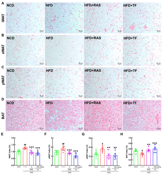 To investigate the efficacy of T. fuciformis on atherosclerosis development, ApoE−/− mice fed an HFD were orally administered with TF daily for a period of 4 weeks (Figure 1A). Compared with the NCD-fed mice, long-term HFD consumption in ApoE−/− mice resulted in enhanced weight gain (p < 0.001; Figure 1B), promoted the development of aortic root lesions, and increased aortic root wall thickness (Figure 1C), as well as enlarged the area of lipid droplets on the vascular wall at the aortic root (Figure 1D). These effects were effectively reversed by four weeks of RAS and TF treatment. Additionally, lipid-driven chronic inflammation has a negative impact on atherosclerosis, and alleviation of hyperlipidemia has become the mainstay of treatment for atherosclerosis [36]. In comparison to NCD-fed mice, the serum levels of TC (p < 0.001; Figure 1E), TG (p < 0.001; Figure 1F), and LDL-C (p < 0.001; Figure 1G) were significantly increased in HFD-induced ApoE−/− mice. Treatment with TF and RAS inhibited the serum levels of TC (p < 0.01; Figure 1E), TG (p < 0.001; Figure 1F), and LDL-C (p < 0.01; Figure 1G) in HFD-induced ApoE−/− mice. Interestingly, HFD intake and RAS treatment showed no significant impact on altering the serum levels of HDL-C; however, TF treatment increased the serum HDL-C levels (p < 0.001; Figure 1H) in HFD-induced ApoE−/− mice. Moreover, TF and RAS treatment inhibited adipocyte hypertrophy and vacuolization in iWAT (Figure 2A), eWAT (Figure 2B), and BAT (Figure 2D), but TF did not inhibit adipocyte hypertrophy and vacuolization in pWAT (Figure 2C) in HFD-induced ApoE−/− mice. The indexes of iWAT (p < 0.01; Figure 2E), eWAT (p < 0.01; Figure 2F), and pWAT (p < 0.05; Figure 2G) were enhanced, while the BAT index (p < 0.05; Figure 2H) was strongly decreased in HFD-induced ApoE−/− mice compared to NCD-fed mice, which were significantly reversed by TF and RAS treatment. Overall, these results suggested that T. fuciformis alleviated atherosclerosis progression.