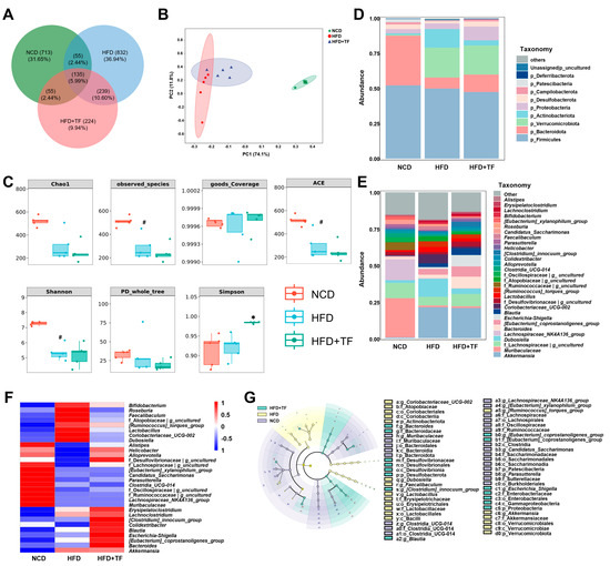 The 16s rRNA was amplified using primer 341F-806R (details are shown in Table S4) from DNA extracted from the cecal contents of NCD, HFD, and HFD+TF mice. Sequencing was performed using the Illumina NovaSeq6000 platform (Illumina, San Diego, CA, USA). The obtained sequences were quality filtered with fastp software (v0.23.0, HaploX, Shenzhen, China) and merged with Fast Length Adjustment of Short reads (FLASH) software (v1.2.11). The sequences were all grouped into variants based on amplicon sequences (ASVs). Using the flattened ASVs, a range of diversity indices were analyzed, and the sequencing depth was assessed. Additionally, the community composition was statistically evaluated using taxonomic data at different levels of taxonomy [34].