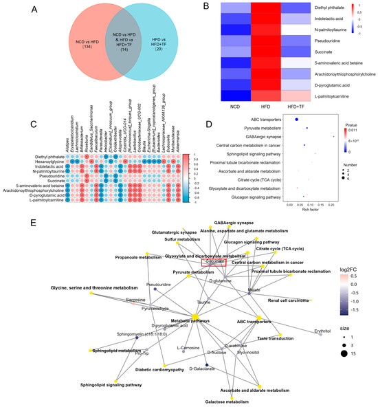 T. fuciformis regulated the serum metabolites in HFD-induced ApoE−/− mice. (A) Venn diagram. (B) Heatmap of serum differential metabolites in each group. (C) Spearman correlation analysis of differential gut microbiota and significantly differential metabolites. Red is a positive correlation, and blue is a negative correlation. (* p < 0.05). (D) KEGG enrichment pathway analysis of different metabolites. (E) Network diagrams of the KEGG pathways and metabolites (n = 5).