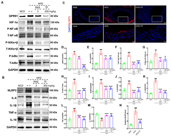 The activation of NF-κB can recruit inflammatory cell infiltration and promote the production of inflammatory mediators, thereby exacerbating the inflammatory response in vascular walls and plaque formation in atherosclerotic diseases [37]. T. fuciformis and RAS treatment significantly suppressed the expressions of GPR91 (p < 0.001; Figure 5A,D), HIF-1α (p < 0.01; Figure 5A,E), P-NF-κB (p < 0.001; Figure 5A,F), P-IKKα+β (p < 0.05; Figure 5A,G), and P-IκBα (p < 0.001; Figure 5A,H) in the aortic root of HFD-induced ApoE−/− mice. In addition, NF-κB activation and nuclear translocation can promote NLRP3 expression [38]. T. fuciformis and RAS treatment effectively decreased the contents of NLRP3 (p < 0.001; Figure 5B,I), IL-6 (p < 0.001; Figure 5B,J), IL-1β (p < 0.001; Figure 5B,K), and TNF-α (p < 0.001; Figure 5B,L) and increased the IL-10 levels (p < 0.01; Figure 5B,M) in the aortic root of HFD-induced ApoE−/− mice. The suppressive effect of T. fuciformis on the expression of NLRP3 in the aortic root was also validated by the IF analysis (p < 0.001; Figure 5C,N). The findings suggested that T. fuciformis treatment suppressed the NF-κB-mediated inflammatory response to regulated inflammation in HFD-induced ApoE−/− mice.