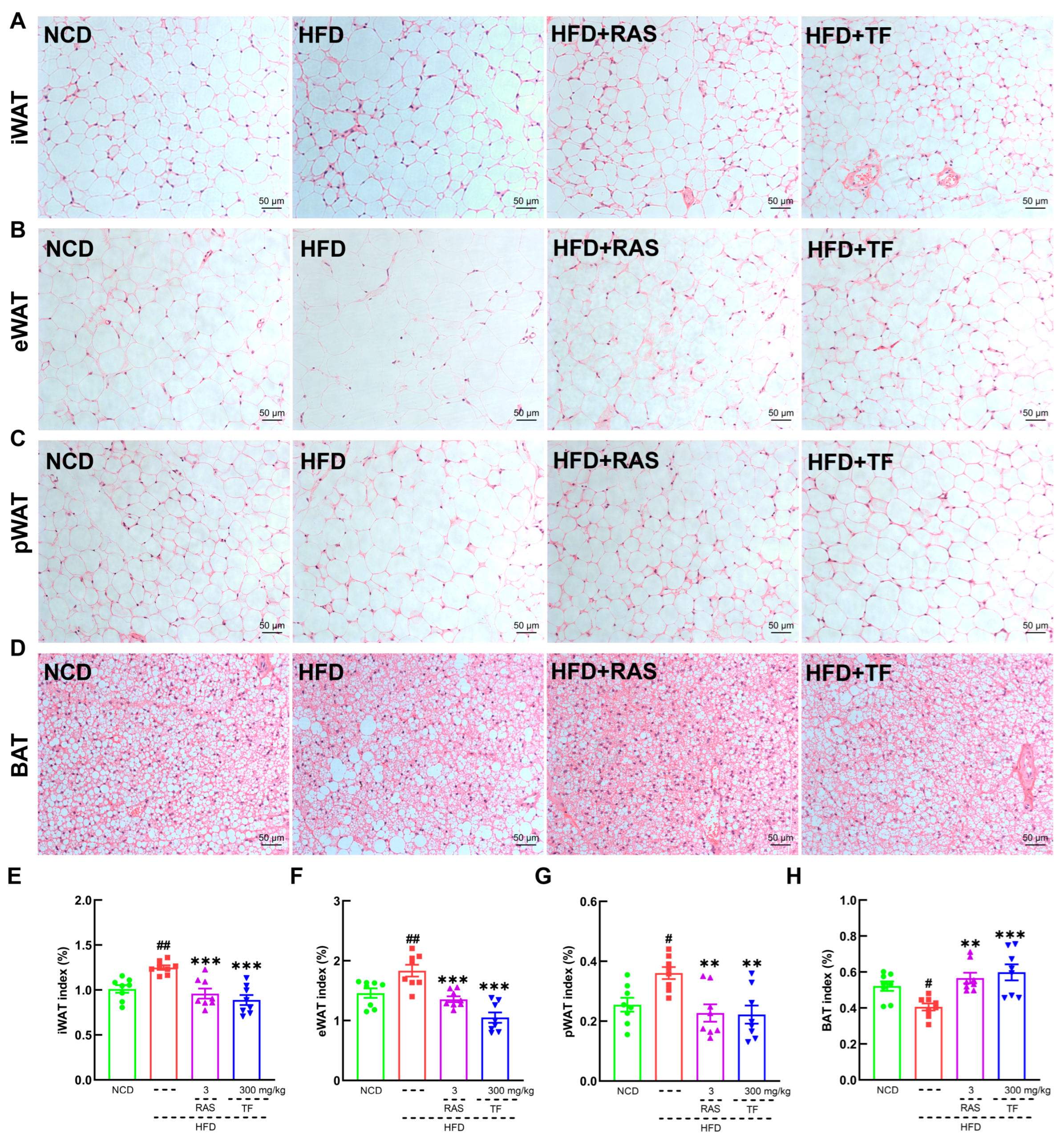 T. fuciformis attenuated fat accumulations in HFD-induced ApoE−/− mice. Histopathological analysis of (A) iWAT, (B) eWAT, (C) pWAT, and (D) BAT by H&E staining: (200×; scale bars = 50 µm) (n = 3). T. fuciformis decreased the indexes of (E) iWAT, (F) eWAT, and (G) pWAT and increased the index of (H) BAT (n = 8). All data are expressed as mean ± S.E.M. # p < 0.05, ## p < 0.01 vs. NCD mice. ** p < 0.01, *** p < 0.001 vs. HFD-induced ApoE−/− mice.