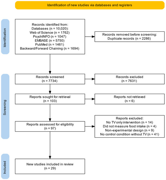 Information was extracted from four online databases: PsycINFO, EMBASE, Web of Science and PubMed. The last search was conducted on 8th January 2024. The search strategy was generated from a combination of keywords in papers, key concepts in the field and strategies used in other reviews [3,4,12]. The following terms were included: eating behaviour, feeding behaviour, food intake, calorie intake, nutrient intake, dietary intake, meal, snacking, portion size, overeating, television, TV, screen, and distract. The full search strategy can be found in Supplementary Table S1.