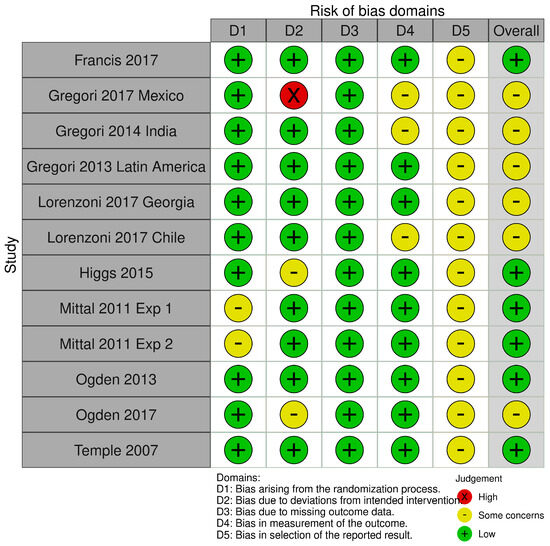 Risk of bias assessments are presented for parallel and cross-over trials in Figure 2 and Figure 3, respectively. For the parallel RCTs (Figure 2), 6 of the 12 studies were rated as low risk of bias [36,37,38,39,42,46] while the others were rated with some concerns, and none were rated as a high risk of bias. All parallel RCTs did not include a priori analysis plans or pre-registrations, so domain D5 was rated with some concern across all trials.
