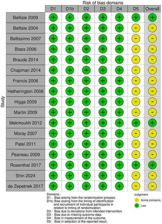 The risk of bias was assessed by one reviewer (T.A.) using a standardised framework developed by Cochrane. The risk of bias was assessed according to the Cochrane RoB 2 tools for parallel randomised clinical trials (RCT) (https://www.riskofbias.info/welcome/rob-2-0-tool/rob-2-for-cluster-randomized-trials, Accessed on 15 November 2024) and for Crossover trials (https://www.riskofbias.info/welcome/rob-2-0-tool/rob-2-for-crossover-trials, Accessed on 15 November 2024). Studies were classified as either Low, Some Concerns, or High risk of bias across 5 or 6 domains for parallel trials or cross-over trials, respectively, and then given an overall risk of bias.