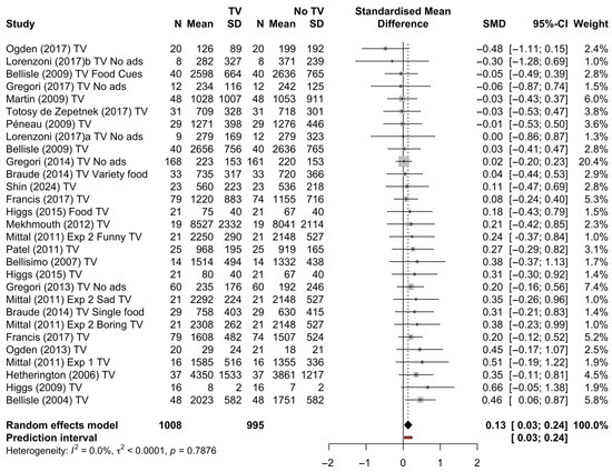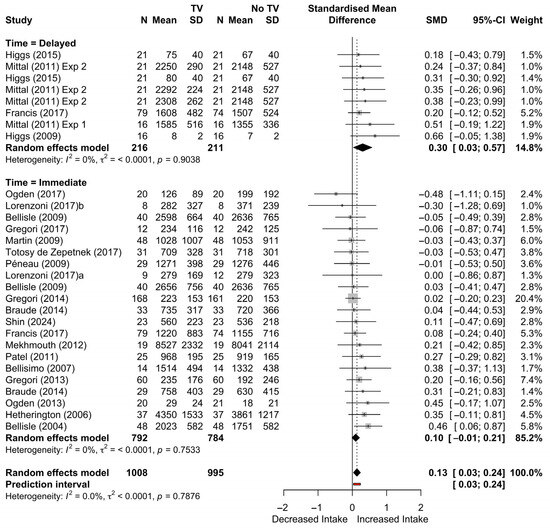 This review analysed the influence of television viewing on food intake across 29 experimental studies. This review provides both a qualitative systematic synthesis of the literature and a quantitative meta-analysis of the effect of television watching on food intake under experimental conditions. Most studies assessed immediate food consumption, while a smaller number focused on delayed intake. The studies included participants ranging from children with an average age of 4.6 years old, with sample sizes as low as 8 up to 168 (within an allocated group). Some studies used females only, while others included both sexes. Across the 23 studies and 57 effect sizes considered for meta-analysis, there was no overall significant effect of watching television on food intake. Among these studies there were high levels of heterogeneity which may have contributed to this null effect. When we excluded studies that manipulated television in the context of other distractors such as advertisements and/or toys, 29 effect sizes from 23 studies were meta-analysed. From this meta-analysis on a subset of comparisons, there was a significant overall effect of television watching on food intake, noting that this overall effect was small (g = 0.13). Across this subset, there was considerable heterogeneity in the effects of television viewing pm food intake, with one reporting a 37% (~73 kcal) reduction in intake [42] and another reporting 57% (~10 g) increase in intake [41]. Further moderation analyses show that this small effect size appears to be driven by the effects of television on later food intake (g = 0.30), while immediate intake (g = 0.10) was not significantly impacted (noting a trend to significance). This translates to a significant increase in food intake (up to 22% higher) at the next meal [13,30], while immediate intake increased by a more mod-est amount between 5–15% [25,29,42]. This result is surprising as multiple cross-sectional and longitudinal studies show a positive relationship between television viewing time and obesity [5], energy intake [7], and intake of “discretionary” or junk foods [6].